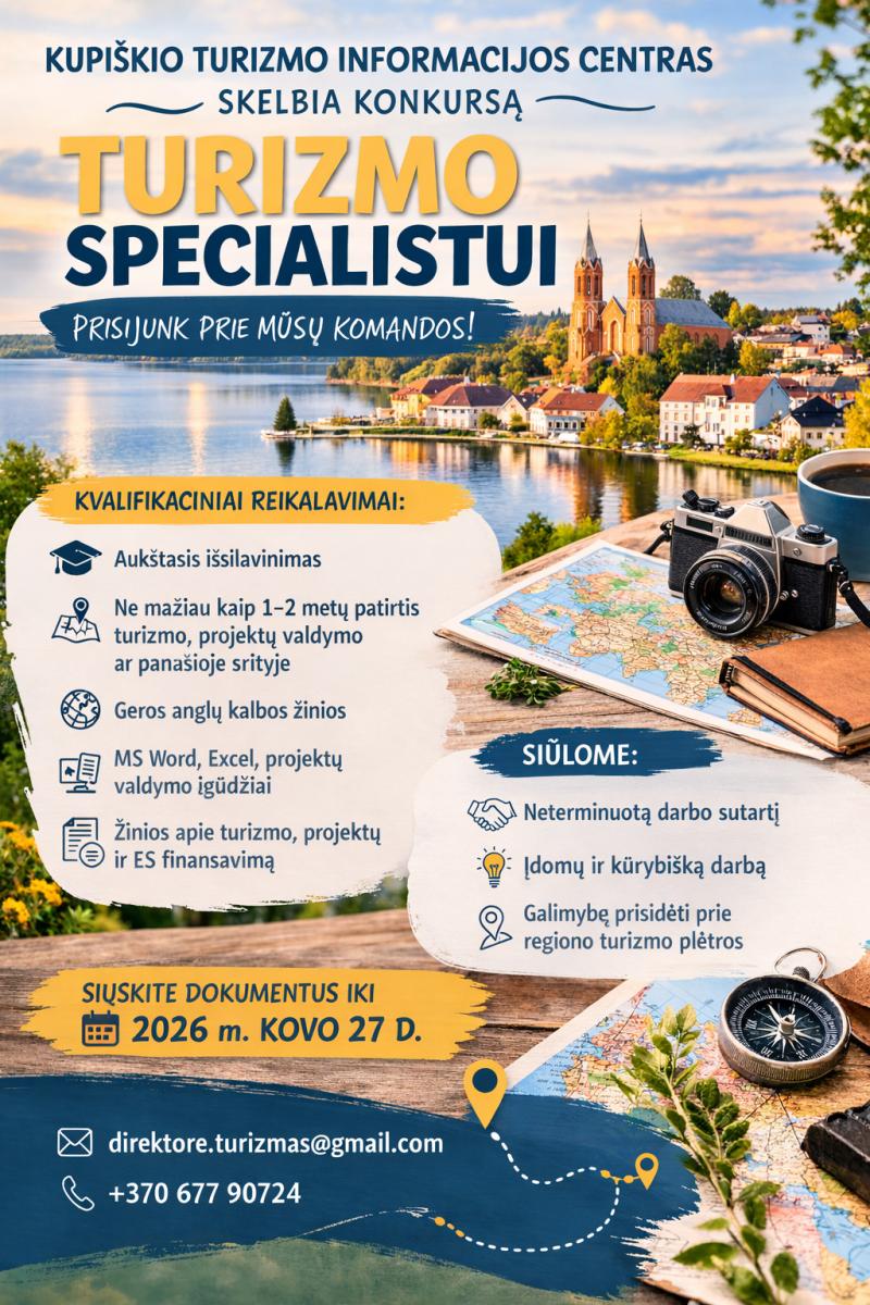 Jei domiesi turizmu, turi idėjų, kaip pristatyti Kupiškį Lietuvai ir užsieniui, gebi dirbti su projektais ir nori prisidėti prie mūsų krašto patrauklumo kūrimo – kviečiame dalyvauti atrankoje.
